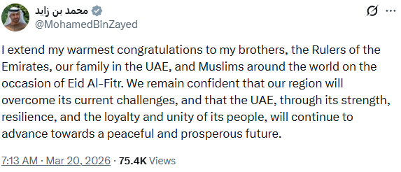 UAE President His Highness Sheikh Mohamed bin Zayed Al Nahyan has congratulated the UAE community and Muslims worldwide on the occasion of Eid Al-Fitr, adding that the UAE will "continue to advance towards a peaceful and prosperous future" amidst the regional developments.